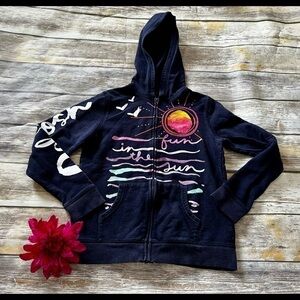 DETAIL:. Full zippered sweatshirt with hood. “Fun in the sun” written across front.