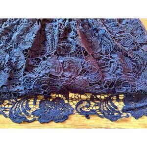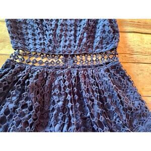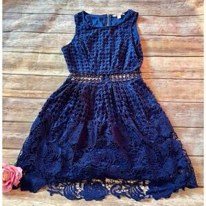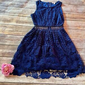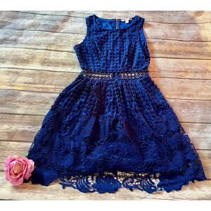 Very cute navy blue dress. Mi Ami. Size medium. Excellent condition. Navy dress. Soft silk inner liner with navy crocheted outer. Mid open area. Sleeveless. Zip back. Approx. 35” length. 100% polyester.