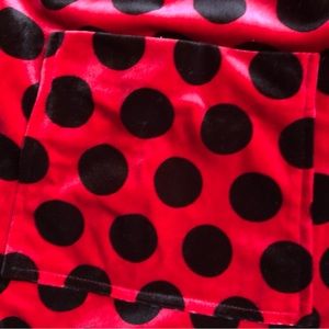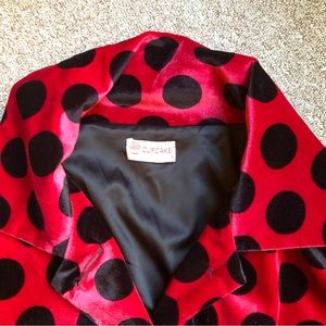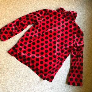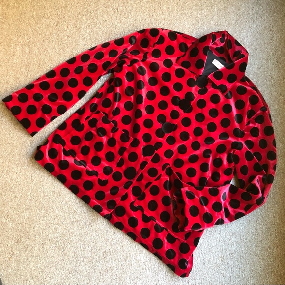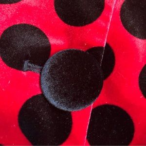 Here is a really pretty fun red velvet top with black polka dots , it has 5 black velvet buttons up the front and 2 pockets. The tag reads cupcake and is marked a small…shoulder to shoulder is 18in sleeve length is 23in pit to pit is 22in and overall length is 26in, it’s in perfect condition no flaws at all and be great dressed up with a black velvet skirt or down with a white shirt and jeans….