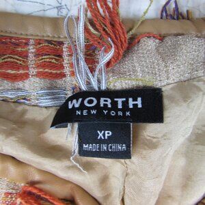 FUN! Worth NY Fringe, snap bohemian embroidered snap Front jacket blazer XSPlove love lovewomenes size XP / measures like a Xsmall Petite art to wear blazer. so cuteperfect fall colorssnap frontfaux leather trimscollarlesslinedmeasured laying flat across the frontshoulder to shoulder;13"pit to pit:17"length:19.5"sleeve:23"FUN! Worth NY Fringe, snap bohemian embroidered snap Front jacket blazer XSP
