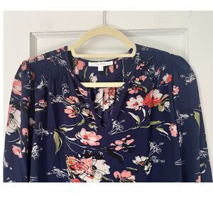 FUN2FUN Blouse Kinny Split Neck Women's Size S Navy Blue Floral Top 3/4 Sleeve
