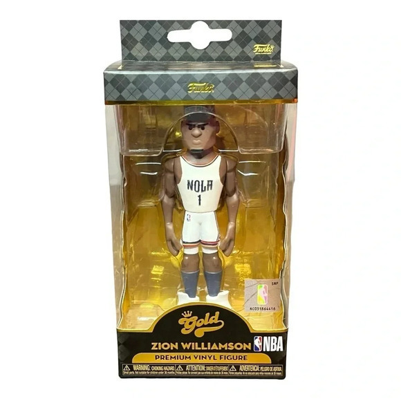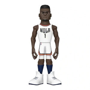 New in Box FUNKO GOLD NBA Zion Williamson premium vinyl figure, dressed in his New Orleans Pelicans home game uniform, sleek, display-ready box, 12" tall.