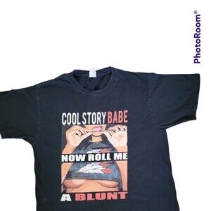 'COOL STORY BABE, NOW ROLL ME A BLUNT' TSHIRT. Size Large. No brand. Some but minimal washwear/fading to black. Graphic might have a couple cracks but over all still great!