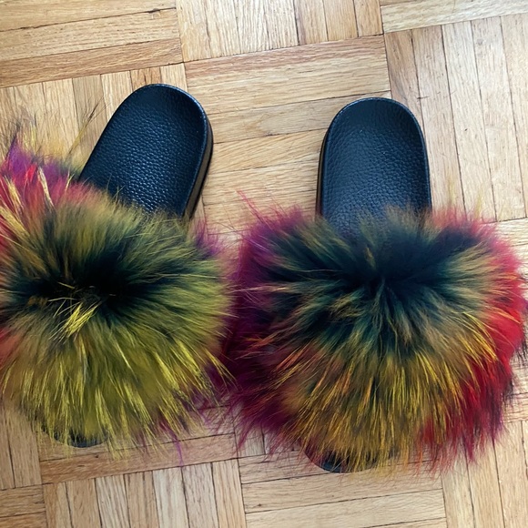 Colorful Fox fur slides Super comfy Size 10 100% real fur Worn 2 times