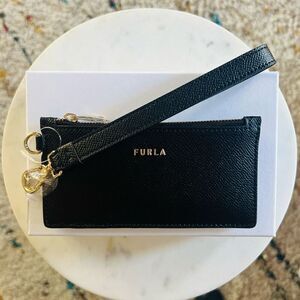 FURLA Classic Credit Card Case Leather Wallet Wristlet, Black, Wrist Strap, NWT