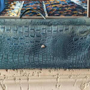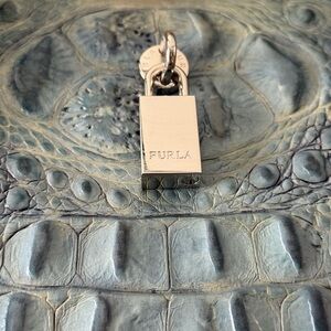Luxurious Furla Crocodile embossed leather handbag with rich purple interior. Features secure zip pocket, silver lock detail. Excellent used condition with one minor rub on corner that is not really noticeable due to shimmer of the embossed leather. Great size. This beauty can hold a lot!