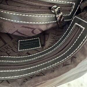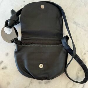 One of a kind, unique bag from FURLA. Color black with white contrast stitching. Approximate dimensions: 8.5”x7.5”x2”. Adjustable tie leather shoulder strap. Pre-owned, in very good condition. There are some scratches on the round metal decorative piece- please see close up picture.