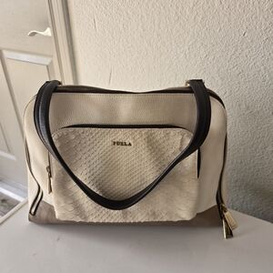 Discover the elegance of the Furla Cream and Tan Shoulder Bag, a perfect blend of style and functionality. Its structured silhouette and two-tone color scheme make it a versatile accessory for any occasion. Crafted with attention to detail, this bag offers a timeless appeal with its minimalist design.
