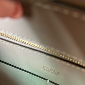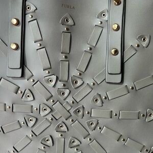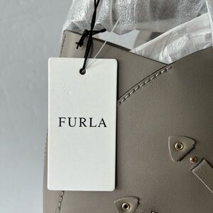 New FURLA taupe leather large tote. Beautiful gold studded design on front. Unlined interior has 1 zippered pocket and 2slip pockets. The bag closes with a magnetic snap. The leather handles are a 9” drop to the top of the bag.
