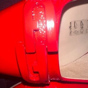 Red patent leather logo plaque red-tone detail round toe branded insole flat rubber sole