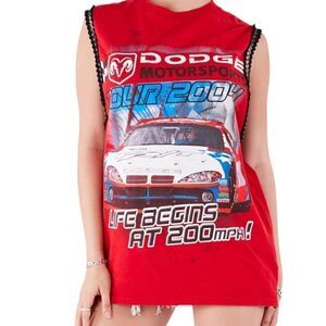 This vintage Nascar tee was sourced and reworked by Furst of a Kind in Los Angeles with a dramatic sleeveless cut and lined with chain trim.