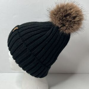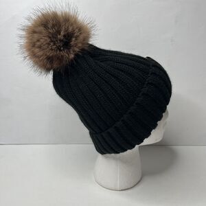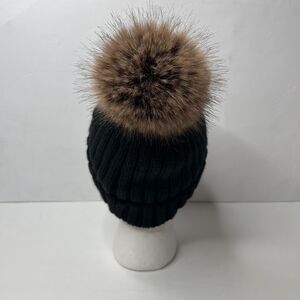 FURTALK Black Winter Satin Lined Faux Fur Pom One Size Beanie Hat