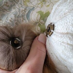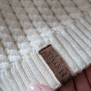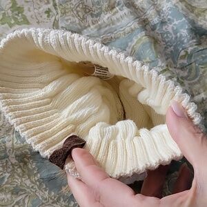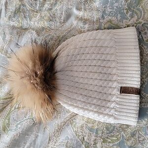 Cream beanie with interchangeable snap-on fur topper. Other pom pom styles can be purchased (I have even seen them on Amazon) for different looks. Heavy knit acrylic with cotton feel, not at all scratchy.