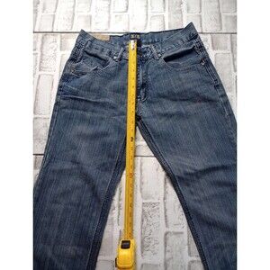 The product is a pair of F.U.S.A.I Western Men's Jeans in size 32x30, featuring a boot cut style and medium wash denim. They have a zip and button closure, a mid-rise, and a 5-pocket design. Made of cotton denim, these jeans are machine washable and come in a solid blue color. With a slim fit and embroidered logo accents, they are perfect for all seasons and have a cowboy and western theme. The brand is Helix, and they are not vintage or handmade. These jeans are a stylish and versatile addition to any man's wardrobe.