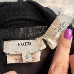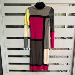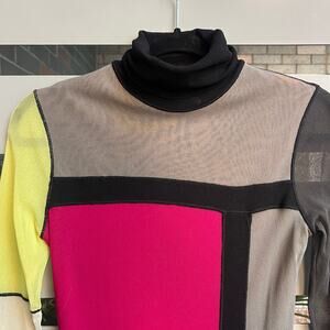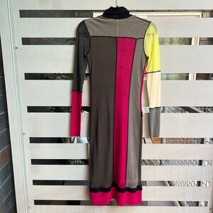 FUZZI by Jean Paul Gaultier Neiman Marcus exclusive colorblock mesh midi dress. Bodycon silhouette with a turtleneck and long semi-sheer sleeves. Body is fully lined. Stretchy mesh fabrication. Size small - 16" pit to pit; 13" waist; 38" length shoulder to hem.