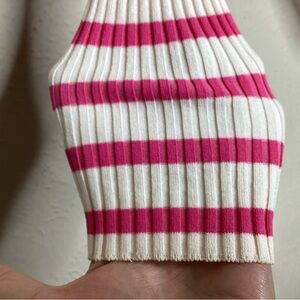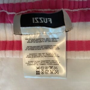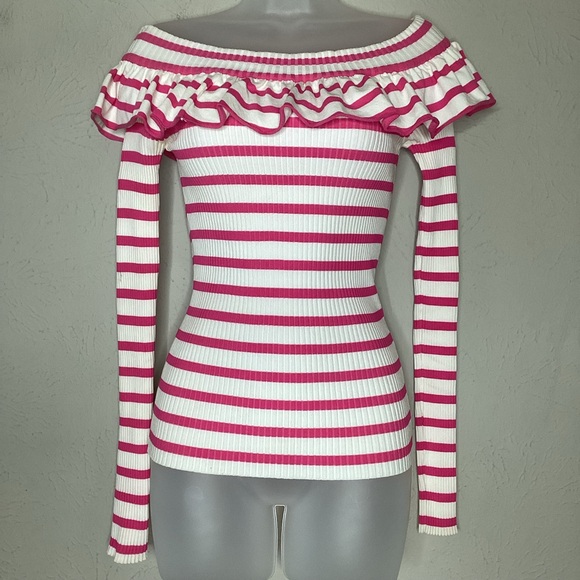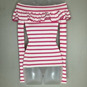 Approx 14”-18” across chest, 10”-20” across bottom, 20” long, 25” sleeves. Pullover, can be worn on or off shoulder, ruffle around top. Bright pink stripes, very stretchy fabric. Made in Italy. Very good condition.