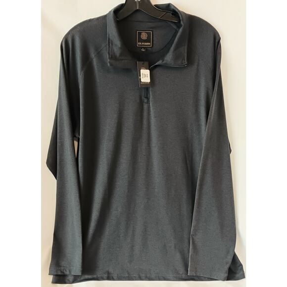 This is a NWT F/X Fusion men's 1/4 zip charcoal gray sportswear pullover in a size large. It is made of 90% polyester and 10% spandex.