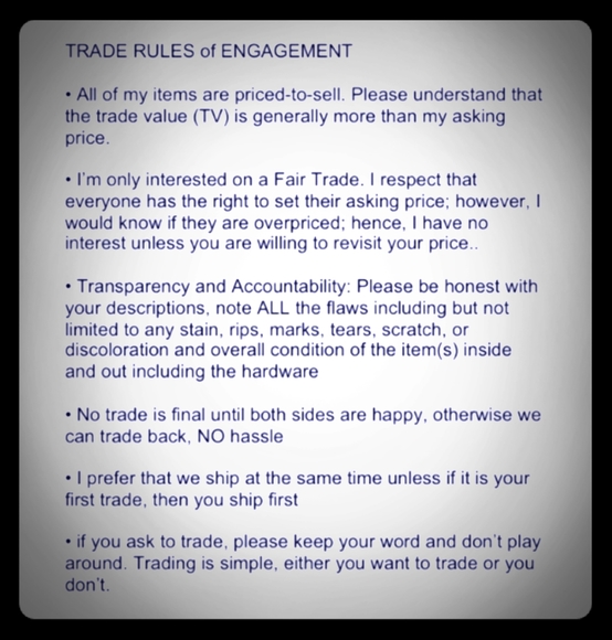 If i can't sell it for your asking price, or if what i can sell it for equals less than the items you're asking for that i KNOW i can sell mine at, then the trade will likely not happen.. and yes, i do research.. Thanks! 😊