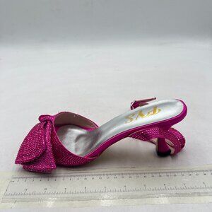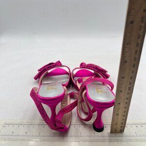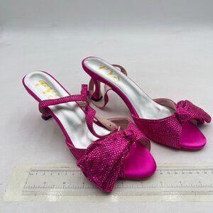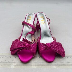 FYS Fuchsia Rhinestones Bow Peep Toe Mid Heel Ankle Strap Satin Dress Sandals