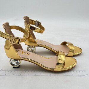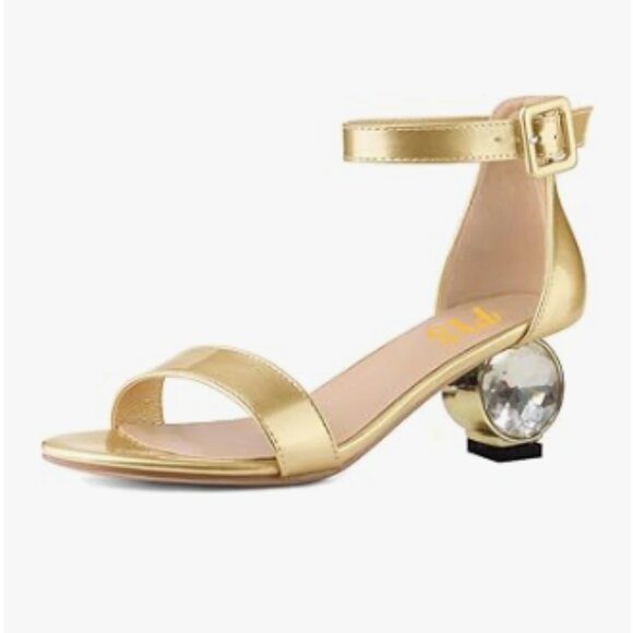 FYS Gold Rhinestone Studded Round Toe Sandals Ankle Strap Block Low Heels Shoes