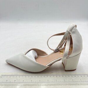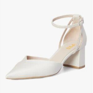 FYS White Pointed Toe Elegant Pumps Ankle Strap Chunky Mid Heel D'orsays V Cut Wedding Prom Shoes