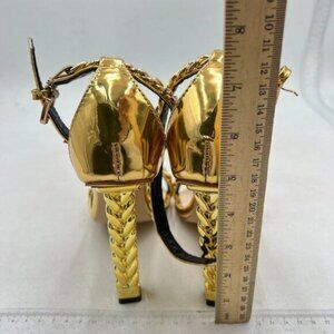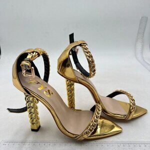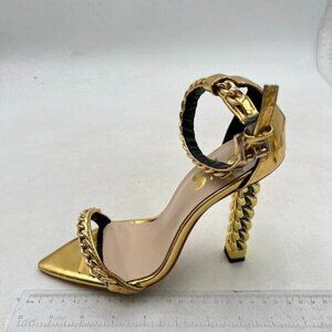 FYS Women Open Toe Ankle Strap Sandals Gold Metal Chain Chunky High Heels Gold