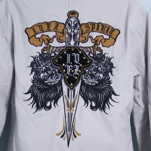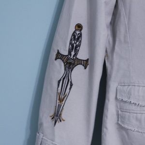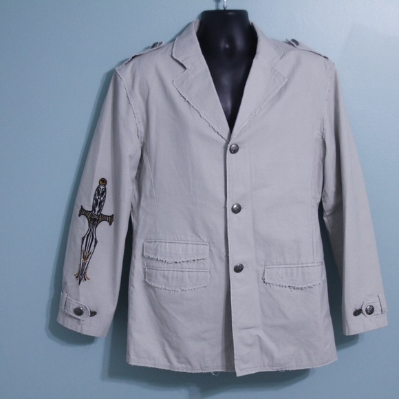 This 3-button jacket is made from 100% cotton on the exterior with a sewn design on the back and right sleeve (see photos)