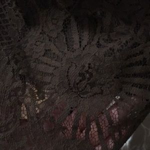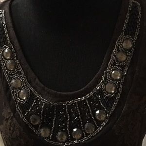 Pretty, sheer, sleeveless sheath dress with beaded embellishment around neckline; All beads intact; Floral brown pattern on lace outer layer; lightweight brown slip attached to outer layer for modesty; Gently used; Size medium, but would fit size small well, too. See measurements in photos. Fabulous paired with OTK boots and jean jacket!