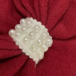 Maroon red dressy winter coat for dogs by Fab Dog. This coat has a high back collar or neckline, a bow on the back with white bead detail, a slit for a leash and double straps under the belly. It is NEW, with tags.