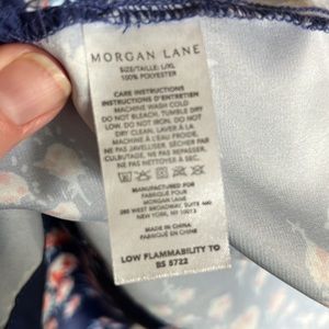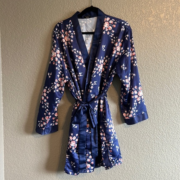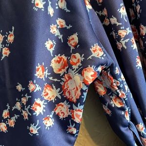 Polyester robe. Navy blue background with roses all over. Long sleeves. It’s super light, great for a warmer climate.
