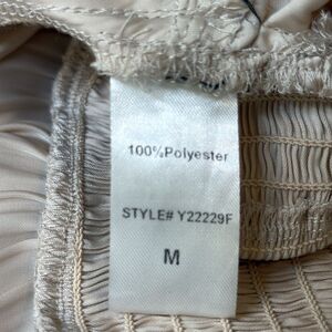 Cream in color with black and silver accents. Smocked bottom. Twist in front.