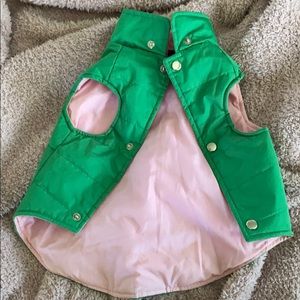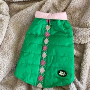 Green with argyle detail and pink linear that is both stylish and practical. Water-resistant, its nylon fabric keeping your dog dry while the plus interior offers extra warmth.