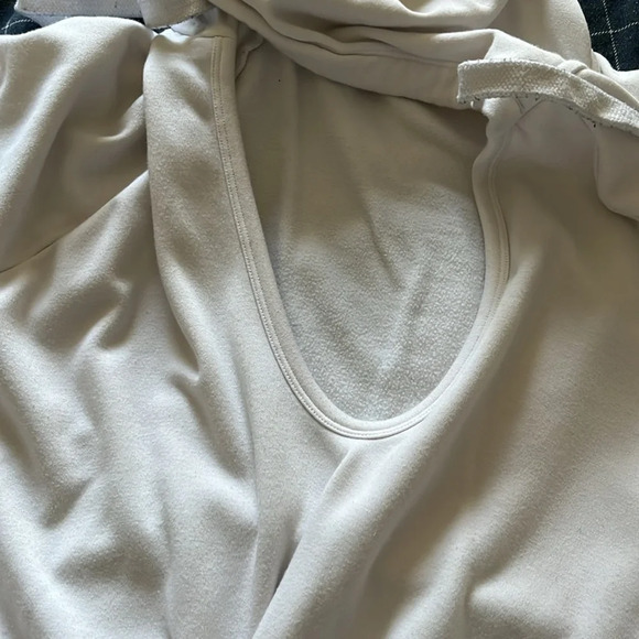 Little dingy since it is white and older. Some light stains that can really only be seen in certain light (look at pictures, I tried to hold the sweatshirt up so you could see the stains! I tried to capture them the best I could!) :)