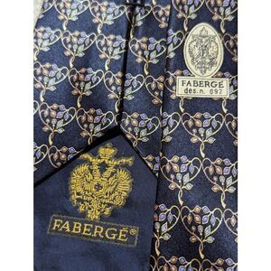 The Fabergé men's silk tie in black, gold, and periwinkle blue is a luxurious accessory. Crafted from 100% silk, it features an exquisite design with a sophisticated color combination. The tie's black base is adorned with elegant gold and periwinkle blue accents, creating a striking and stylish look. Perfect for formal occasions or adding a touch of luxury to everyday attire, this tie is a standout piece that exudes refinement and quality craftsmanship.