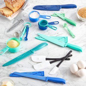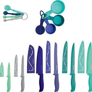 Essential knives and tools for everyday food prep. This 23 piece set includes an 8-inch chef with sheath, an 8-inch slicer with sheath, 8-inch bread with sheath, 7-inch Santoku with sheath, 5.5 inches serrated utility with sheath, 3-1/2inch parer with sheath, 4 measuring cups, 4 measuring spoons, 3 spatulas. 23 piece set features stick-resistant blades and blade covers. Ergonomically designed handles for comfort while cutting. Dishwasher Safe.