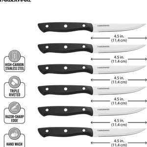 Set includes 6 steak knives. Each knife has a high carbon stainless-steel blade for strength and durability. The serrations on the blade are perfect for cutting meat and poultry. Each knife has a full tang triple-rivet handle. Hand-wash with warm water and a mild detergent; rinse and dry immediately.