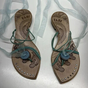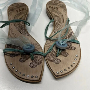 Fabi Sandals Shoes Wooden Low Heel Pointed Toe Jeweled Lace Up Brown Blue Size 38 8