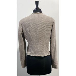 Fringed edging at neckline, front/bottom hem, and cuffs
