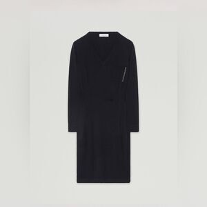 Monili chain-trim knitted dress from FABIANA FILIPPI featuring dark blue, virgin wool-cashmere blend, knitted construction, signature Monili chain detail, chest patch pocket, V-neck, long sleeves, straight hem and knee-length.
