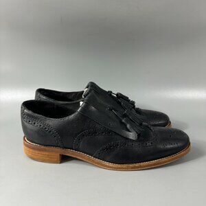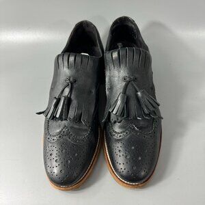 Fabianelli Black Leather Kilty Fringe Tassel Wingtip Oxford Loafers, Size 39