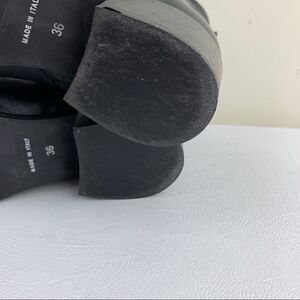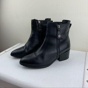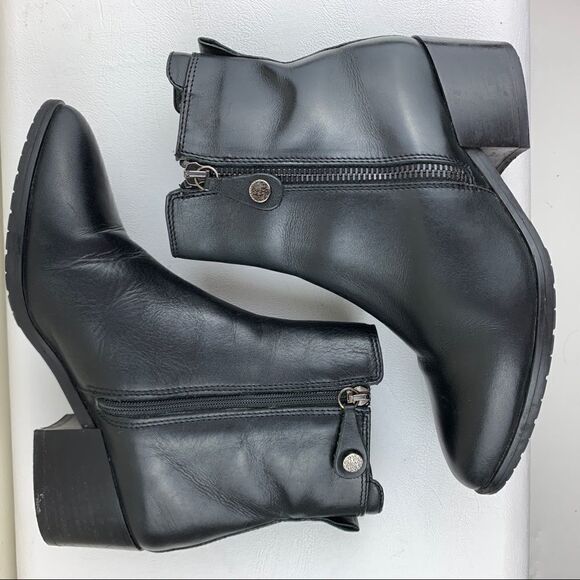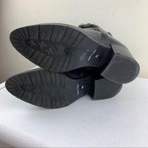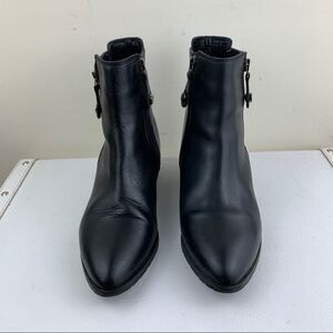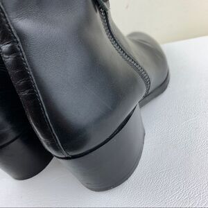 Fabianelli Women’s Italian Black Leather Side-Zip Heeled Booties w/Pointed Toes Sz 6 EUC. Inner zip is real, outer zip is faux. 2“ western style stacked chunky heel. Buttery soft leather uppers, man-made lining and sole. Very slight wear to heel and scratch on heel as shown. Please see photos for additional details.