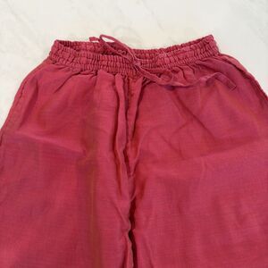 The top is a lime green tunic featuring a colorful floral print. It has three-quarter sleeves and a round neckline. The hem is adorned with green lace trim and a pink scalloped trim.The set includes a pair of flowy, wide-leg palazzo pants in a vibrant pink or magenta color. The pant hems feature a simple green and yellow border design. The material is a cotton-silk blend. It is soft, breathable, and comfortable.