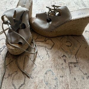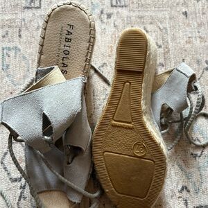 European elegant gray espadrilles. Genuine leather and suede with a rope lace to tie around the ankle. Perfect for any occasion, these shoes offer both comfort and sophistication.