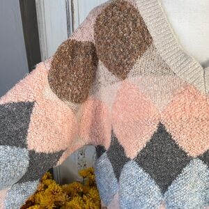 Stay cozy and stylish with this colorful geometric pattern sweater. Featuring a blend of pink, blue, brown, and gray, this sweater is perfect for adding a pop of color to your wardrobe.