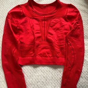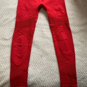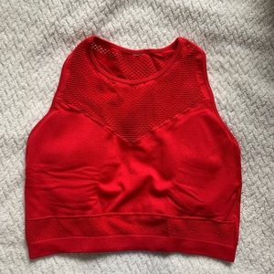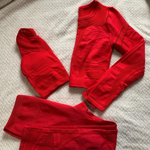 This bright red set is super cute and well taken care of. All of the tags are cut out because they were itchy, but the set fits a small or tight medium. There are mesh details on each piece and look great all together or paired with neutral activewear you already have!