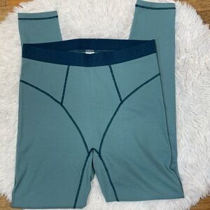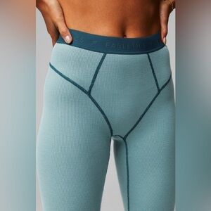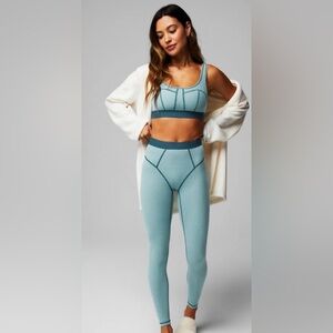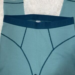 Arctic Wave/Midnight Wave Waffle Leggings. These are the ultimate in cute and cozy loungewear! Pale teal waffled in a super soft and stretchy 68% Polyester/28% Rayon/4% Elastane material. Fabletics branded elastic waistband in a fun turquoise which matches the whimsical, brief style stitching. These are a high-waisted legging with coverstitch detailing, they are both chafe-resistant and incredibly comfy. Love this with a white tank for a cute look around the house!