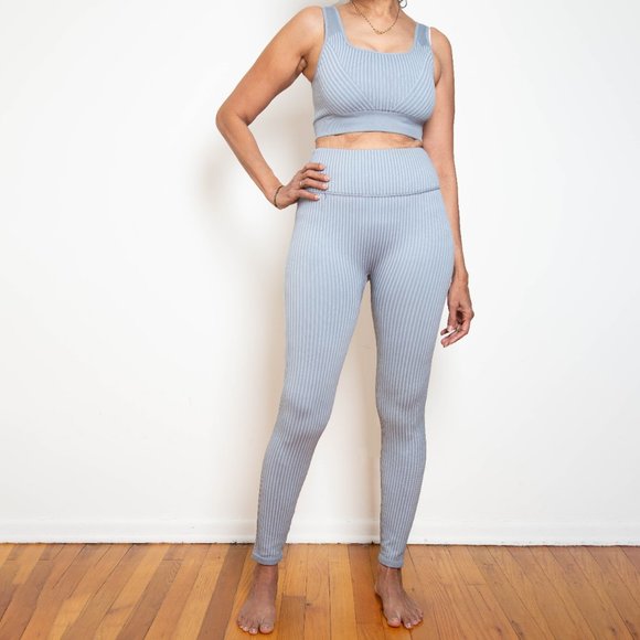 Never worn to workout. Only worn once to take these pictures. Tags removed. High-waisted compressive leggings with ribbed detail in ice blue/grey color with matching sports bra. Size M on both. Selling as a set.