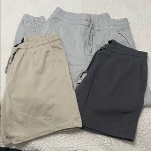 Fabletic men’s athletic shorts. Comfortable and sporty style. 2 pairs black (one with blue draw strings and pocket zipper), 1 all black, 1 navy and 1 light blue/silver. Extremely comfortable shorts! All in excellent used condition.