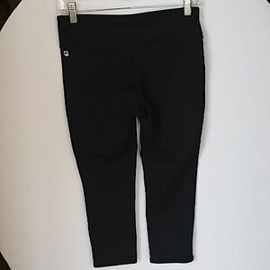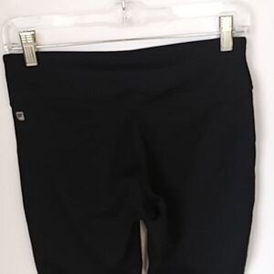 Fabletics high waisted cropped leggings in black with abstract color triangles on each leg hem. Both color triangles are different. One side dominates with plum and blue and the other side with gray and teal. There is a hidden pocket in the right side of the waist band in the front. These are almost new. They have no wear to be seen. The tags were removed. The stretch fabric is matte with a cottony feel. There is no damage and there are no flaws. The stretchiness is firm and brand new feeling. I believe Fabletics considers these to be a small. However, they have a 28.5" waist which is a medium on most size charts. There is no size tag so please go by the measurements below