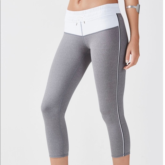 Fabletics capri pants. Color block, grey & white with thin black stripe. Moisture-wicking, stretch material. Excellent condition.